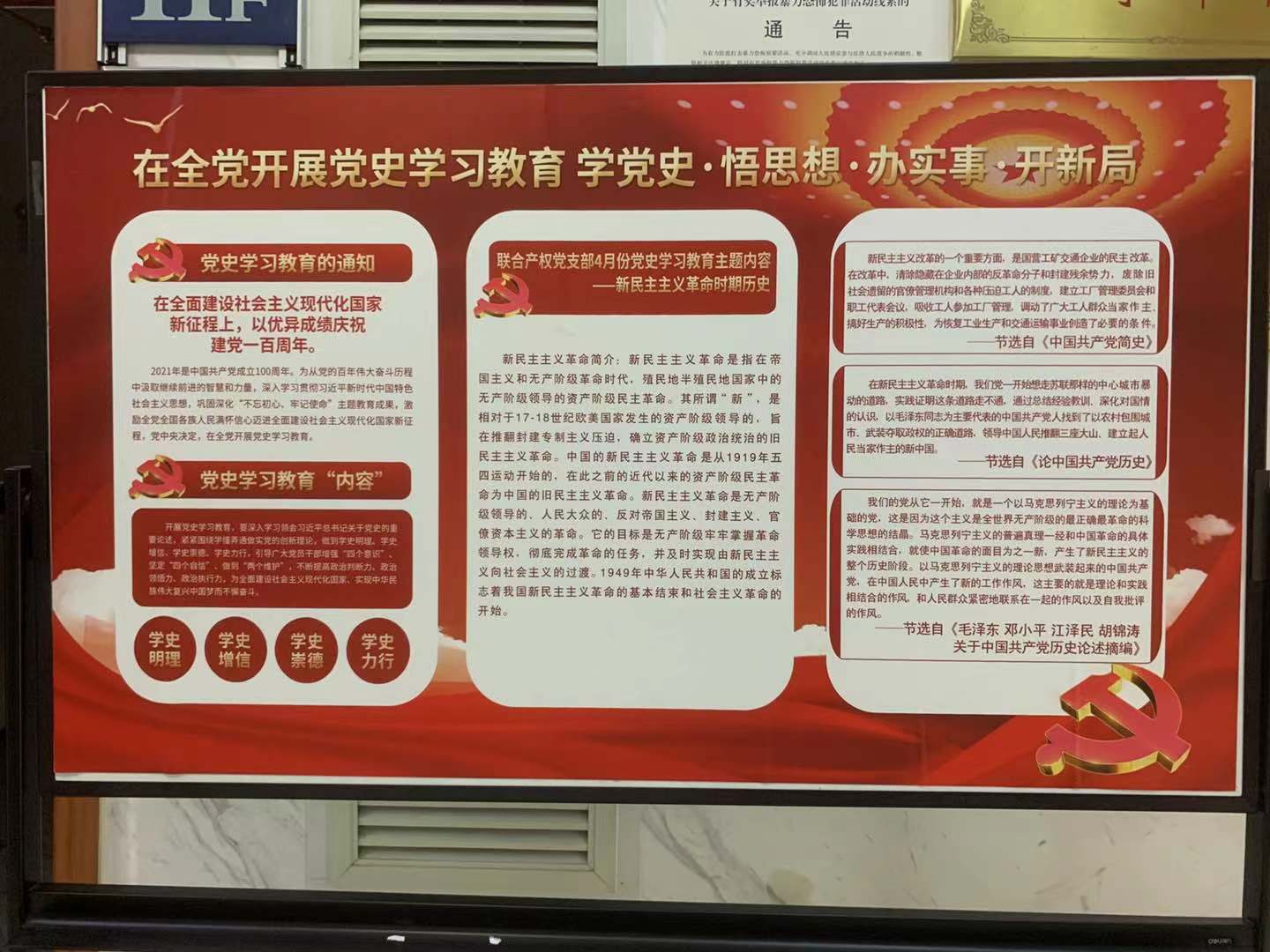 自黨史學習教育開展以來,聯(lián)合產權黨支部通過制定學習計劃、制作月度學習宣傳欄、組織黨員定期學習討論等方式持續(xù)推進學習教育工作。下一步,聯(lián)合產權黨支部將繼續(xù)深入開展黨史學習教育主題活動,切實把黨史學習教育與總結經驗、觀照現實、推動工作結合起來,切實做到學黨史、悟思想、辦實事、開新局,鍛造“不折不扣、不偏不倚”的政治執(zhí)行力,以優(yōu)異成績迎接建黨一百周年。
