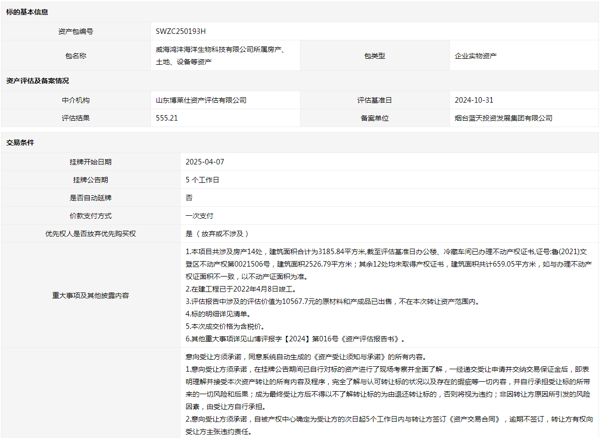 轉(zhuǎn)讓方:威海鴻灃海洋生物科技有限公司