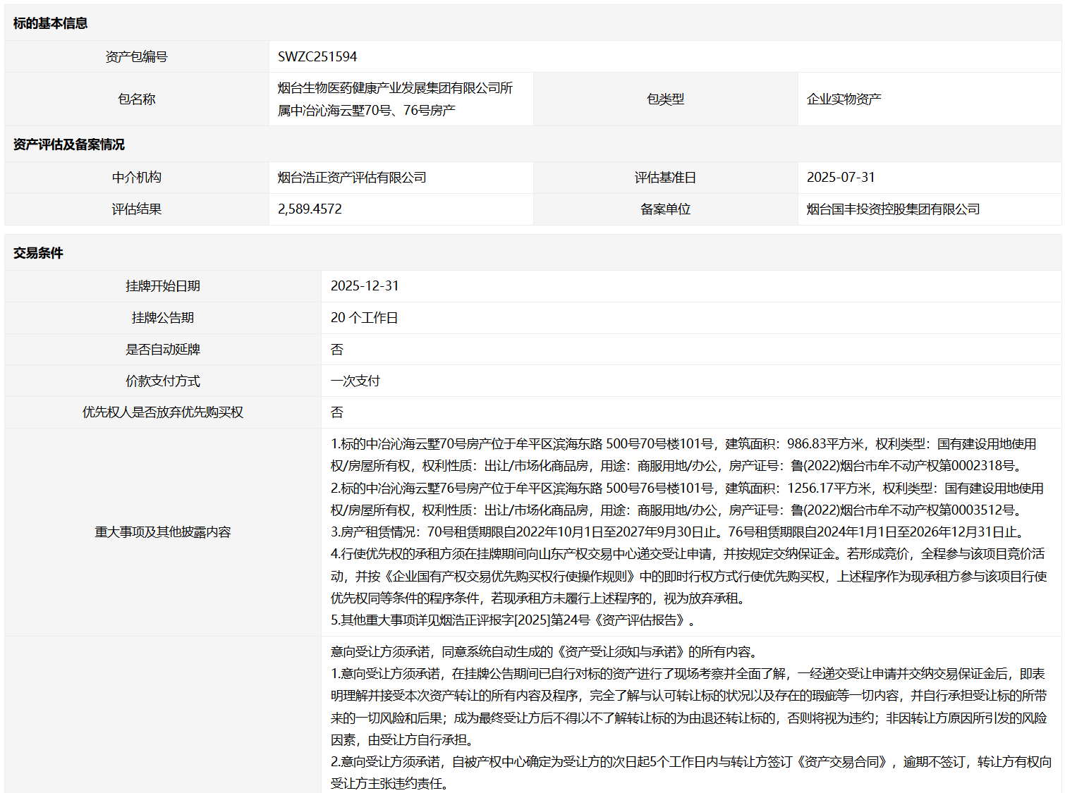 煙臺生物醫(yī)藥健康產業(yè)發(fā)展集團有限公司所屬中冶沁海云墅70號、76號房產