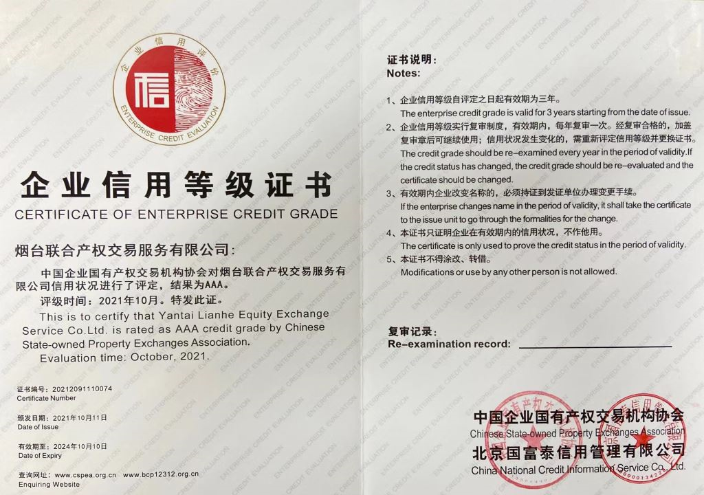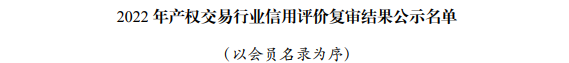 2022年產(chǎn)權(quán)交易行業(yè)信用評價(jià)復(fù)審結(jié)果在全國行業(yè)信用公共服務(wù)平臺和中國產(chǎn)權(quán)網(wǎng)進(jìn)行公示,煙臺聯(lián)合產(chǎn)權(quán)在協(xié)會(huì)信用評價(jià)復(fù)審中,繼續(xù)維持AAA級評定不變。
